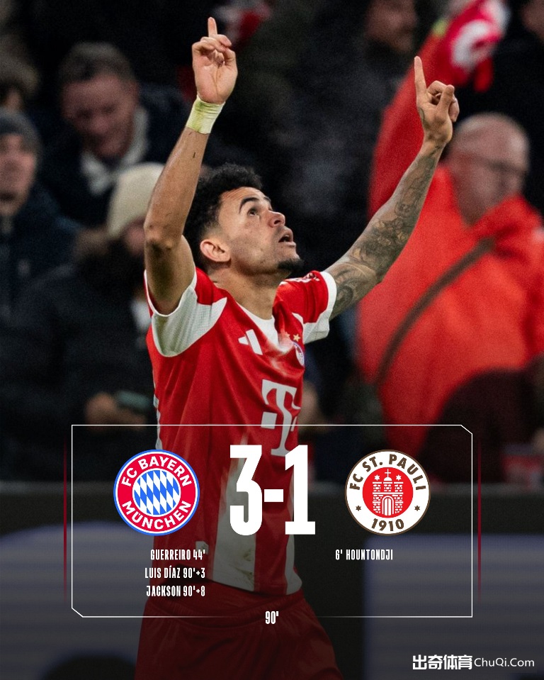北京时间11月29日晚22时30分,2025-26赛季德甲第12轮在安联竞技场展开角逐,拜仁慕尼黑主场迎战圣保利。上半场洪通吉6分钟首开记录+伤退,莱默尔后场被断,卡尔和比朔夫中柱,格雷罗扳平比分,迪亚斯倒地助攻,下半场凯恩中柱,迪亚斯和杰克逊补时连入2球。最终拜仁主场3-1逆转圣保利,拜仁联赛12轮不败+8分优势领跑。