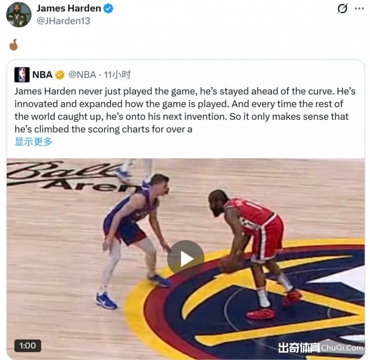 本人转发!NBA官方:哈登走在篮球潮流前沿 不断创新打法