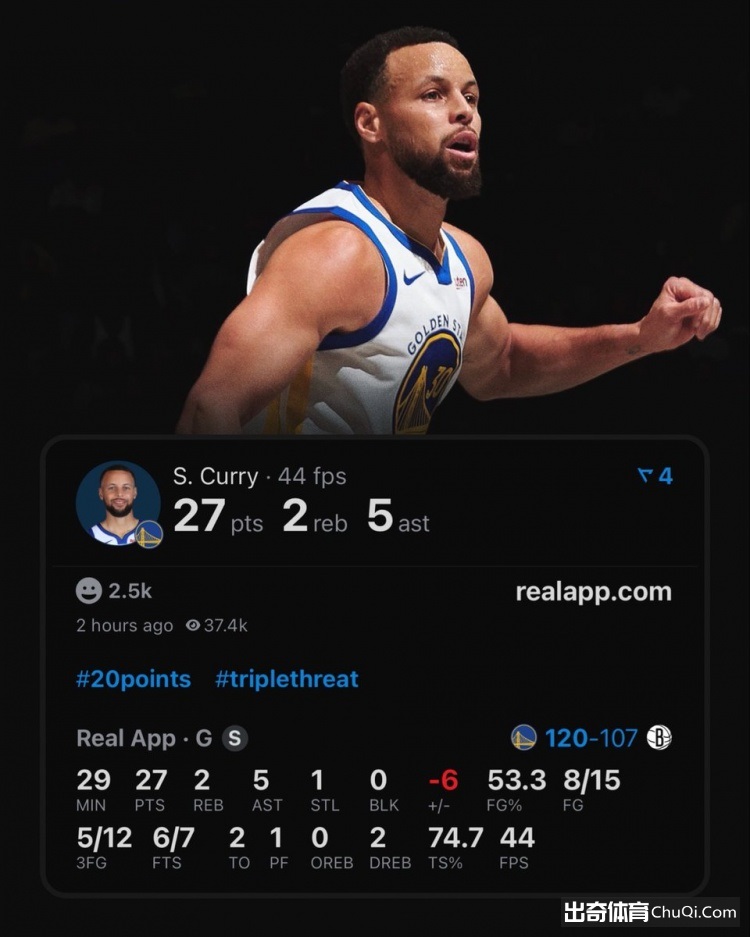 本场比赛,库里出战28分钟,15中8,三分12中5,罚球7中6,砍下27分2板5助1断。
