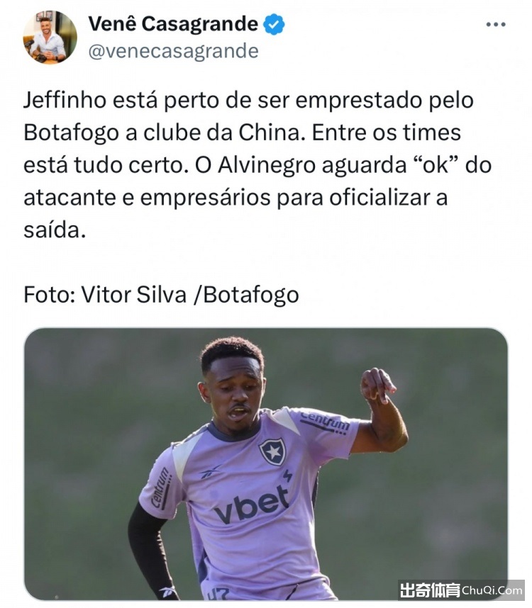 1月6日讯 据巴西记者Vene Casagrande报道,博塔弗戈前锋热菲尼奥即将加盟中超球队。