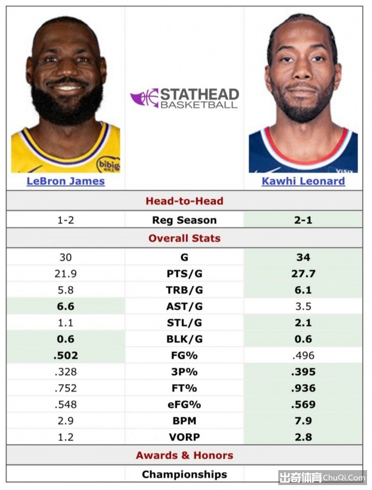 伦纳德赛季场均27.7分6.1篮板3.5助攻2.1抢断;詹姆斯场均21.9分5.8篮板6.6助攻1.1抢断。本赛季两人交手3次,快船2胜1负。