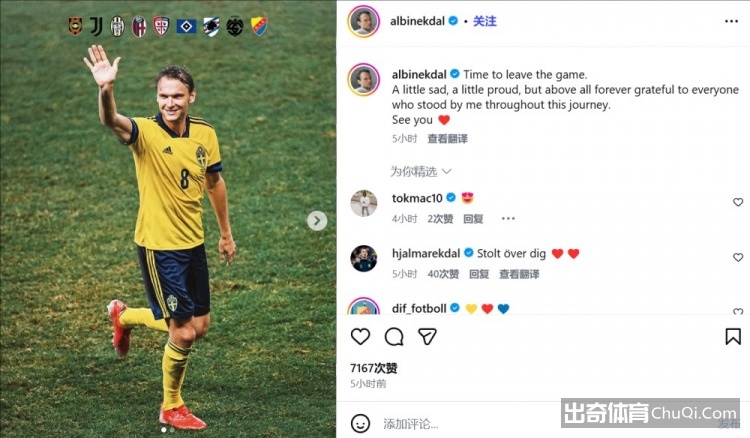 前尤文中场、瑞典国脚埃克达尔通过社交媒体,宣布了自己退役的决定。埃克达尔写道:“是时候告别这场比赛了。有一点难过,有一点自豪,但最重要的是永远感激在这段旅程中一直支持我的每一个人。